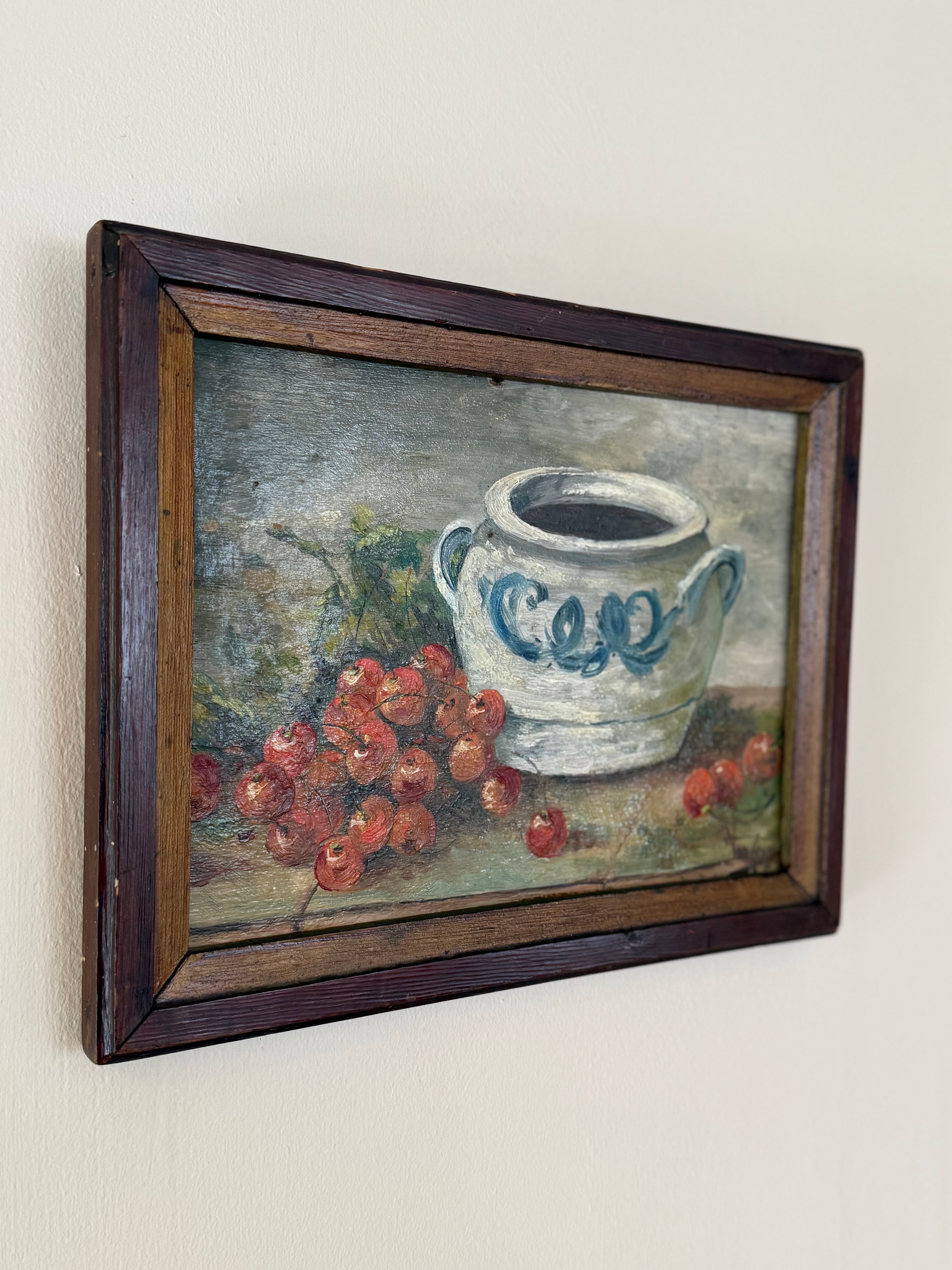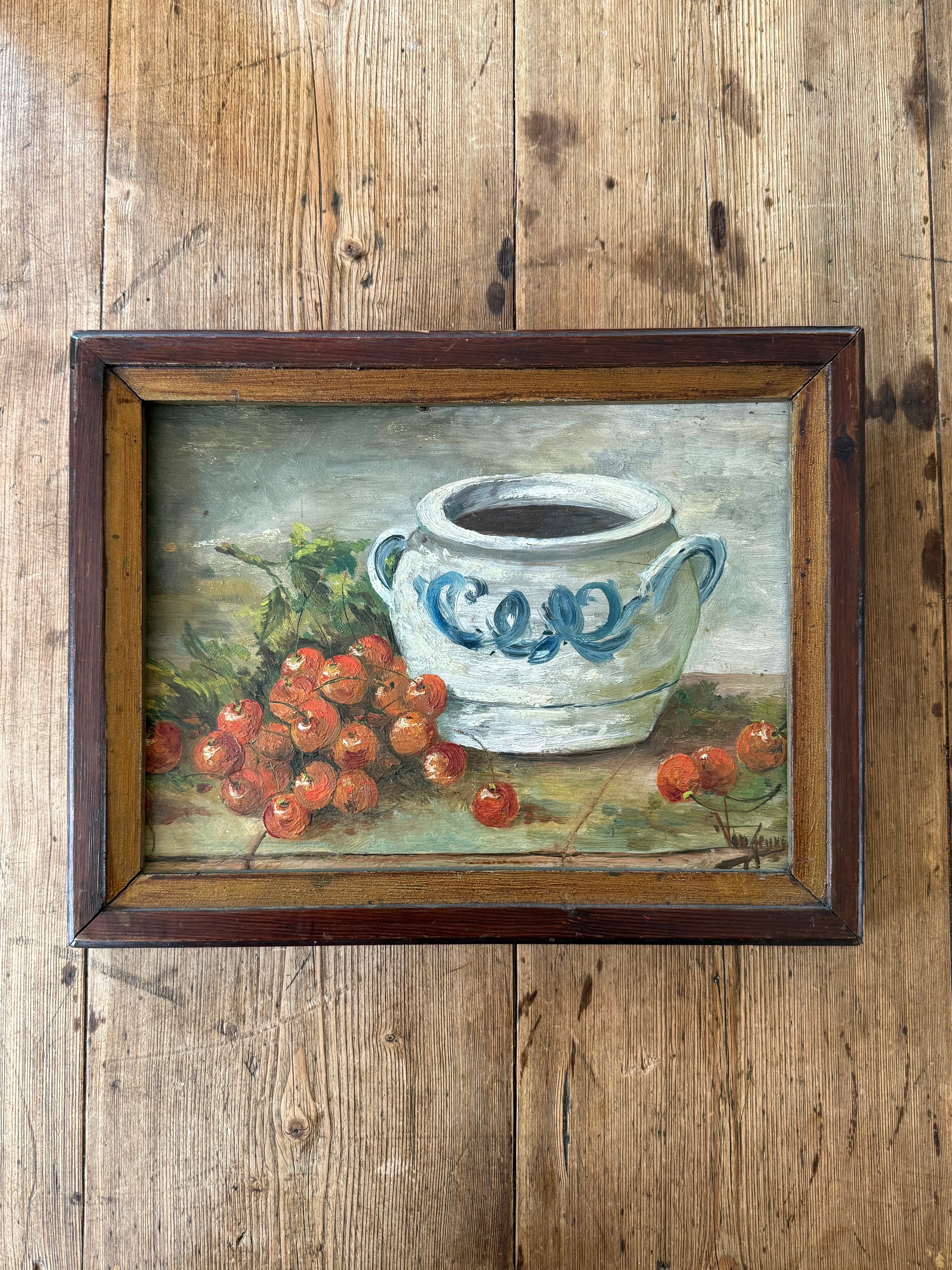 This French still life captures the simple poetry of the kitchen. A rustic confit pot with cobalt blue decoration is set beside a tumble of ripe cherries, the kind of everyday tableau once found in farmhouse kitchens across the French countryside.