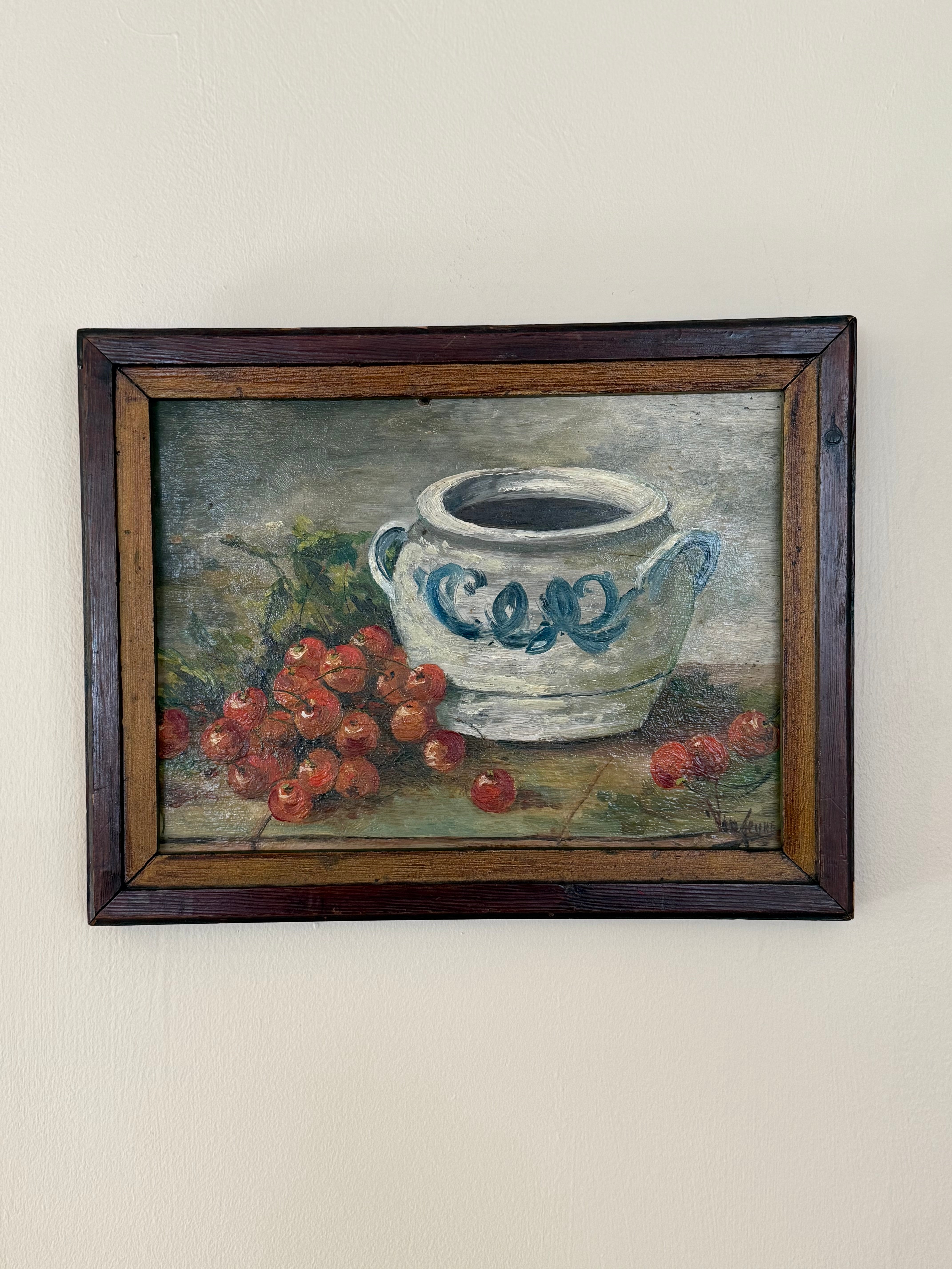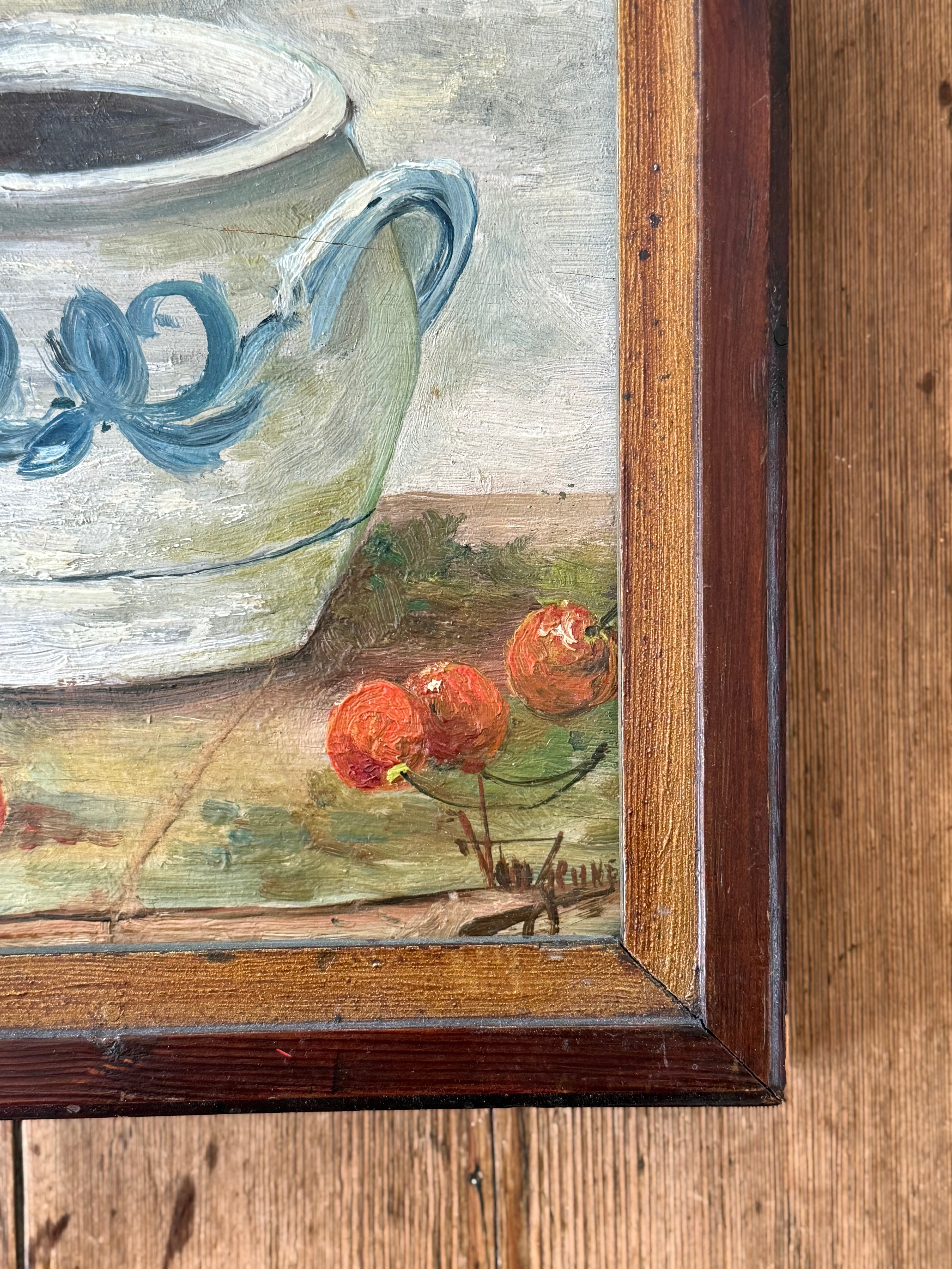 Painted in oil and signed by the artist, the work reflects the enduring tradition of nature morte in France. The confit pot itself is a cultural icon, once used to preserve meats and now beloved as a decorative staple in vintage interiors. Paired with the warmth of summer fruit, the composition evokes a sense of abundance and timeless charm.
